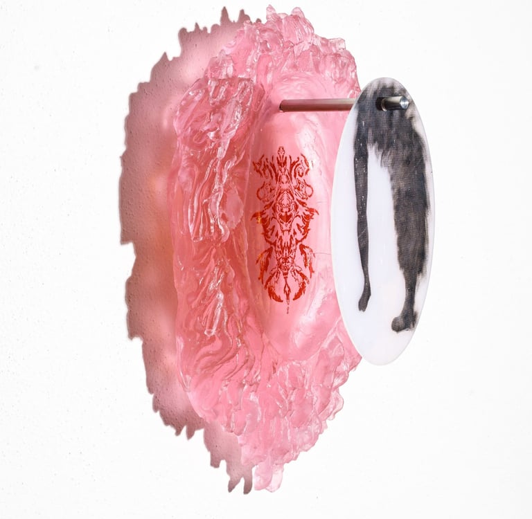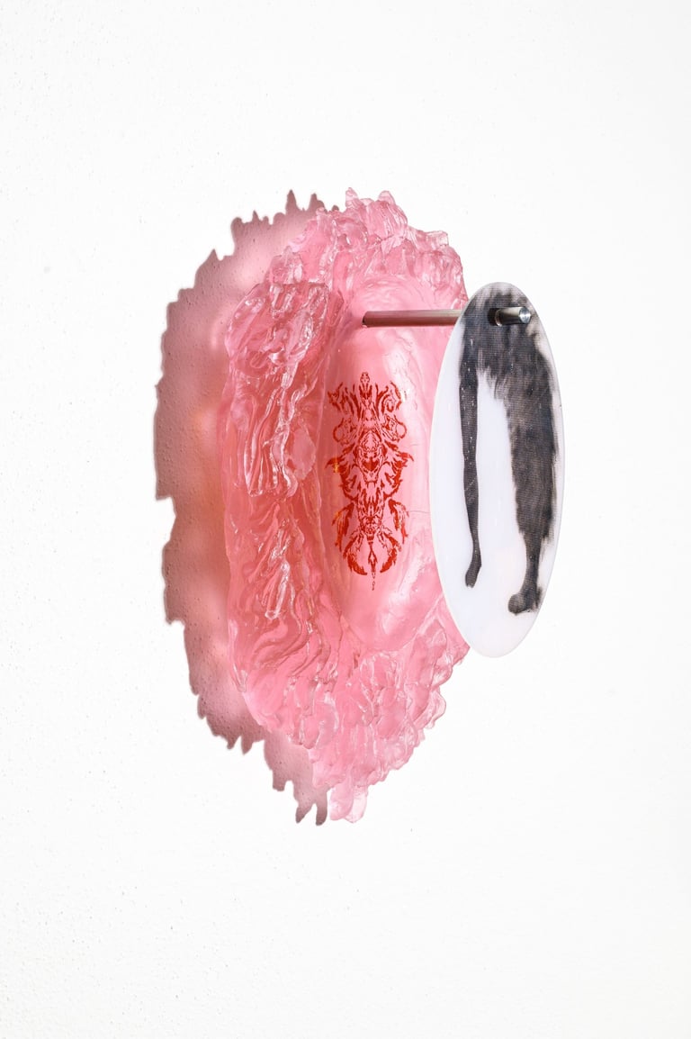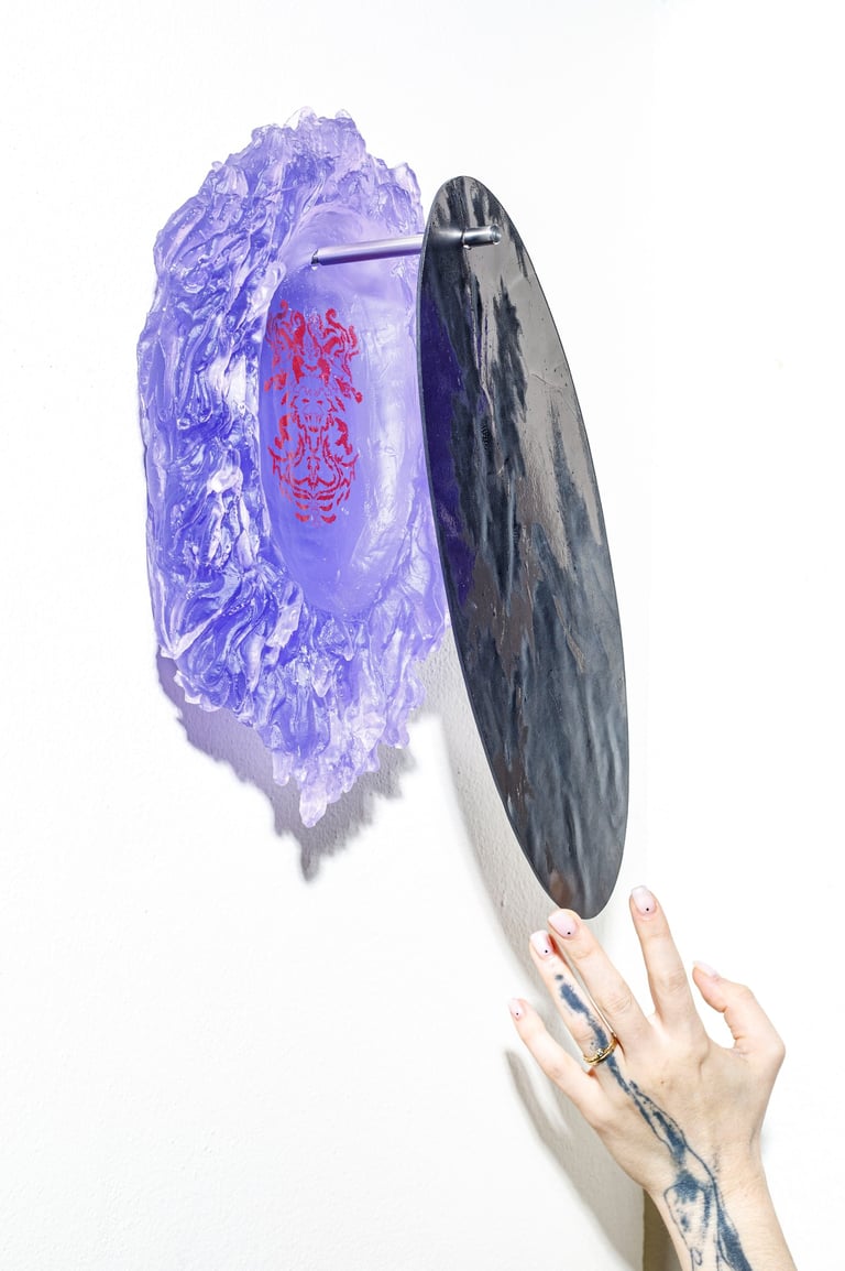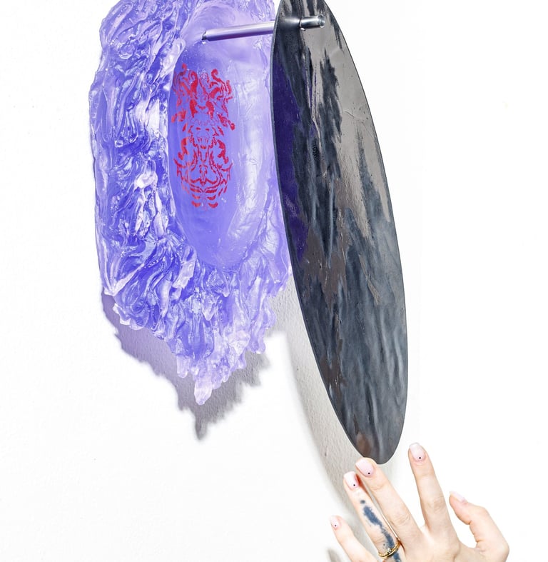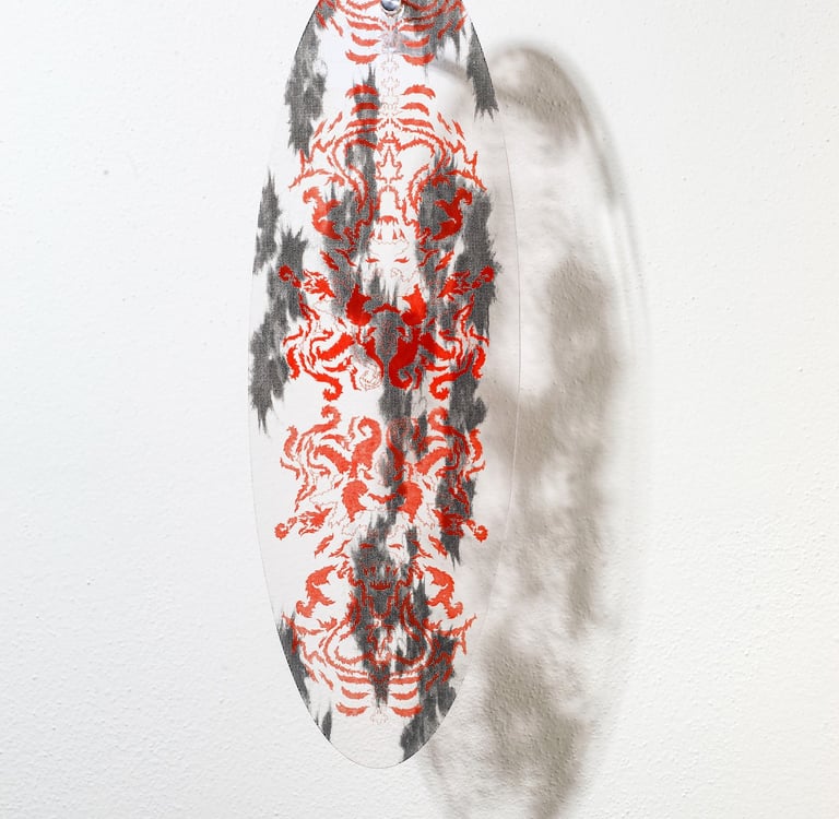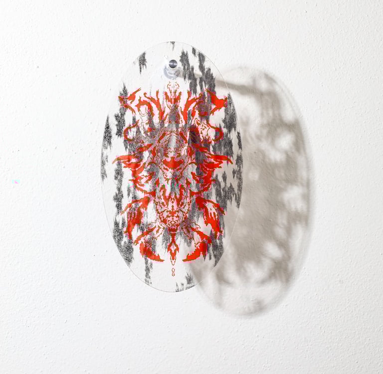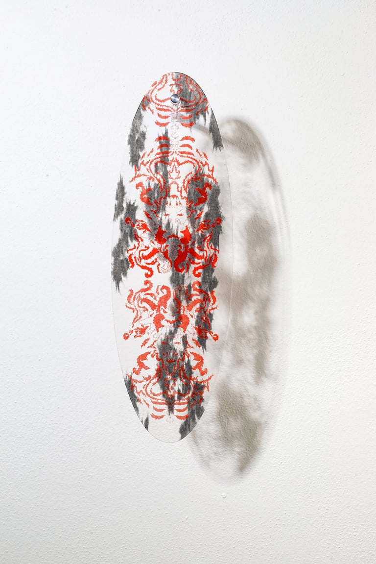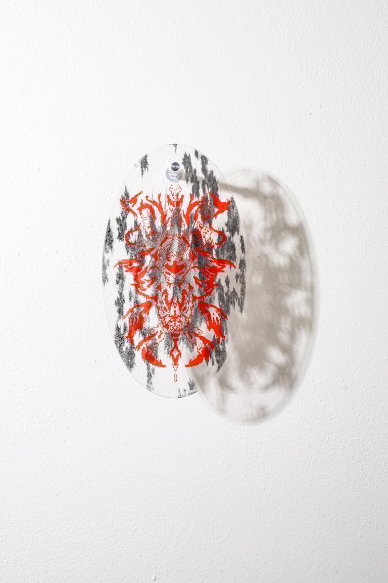 Reliquary? are wall objects inspired by the symbiosis between man and nature. The illustrations on the reliquaries represent the remains of our ancestors. On each object there is a skeleton of some kind of humanoid - a cross between a person and an animal.