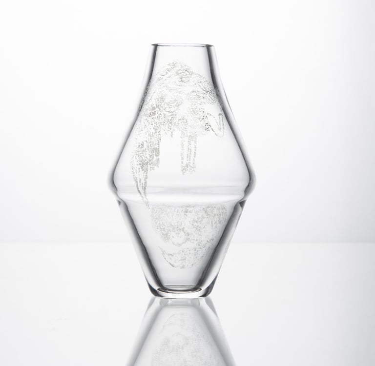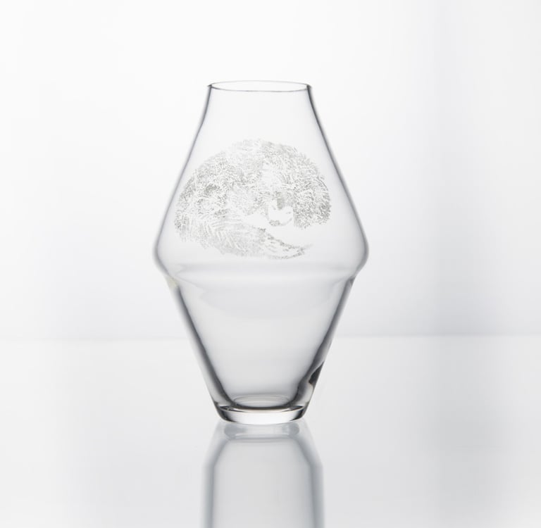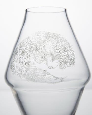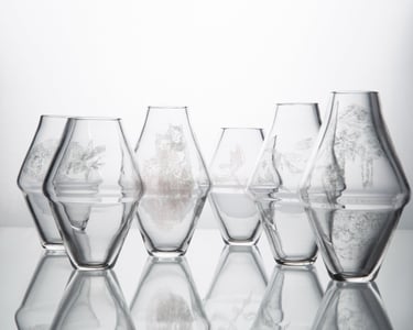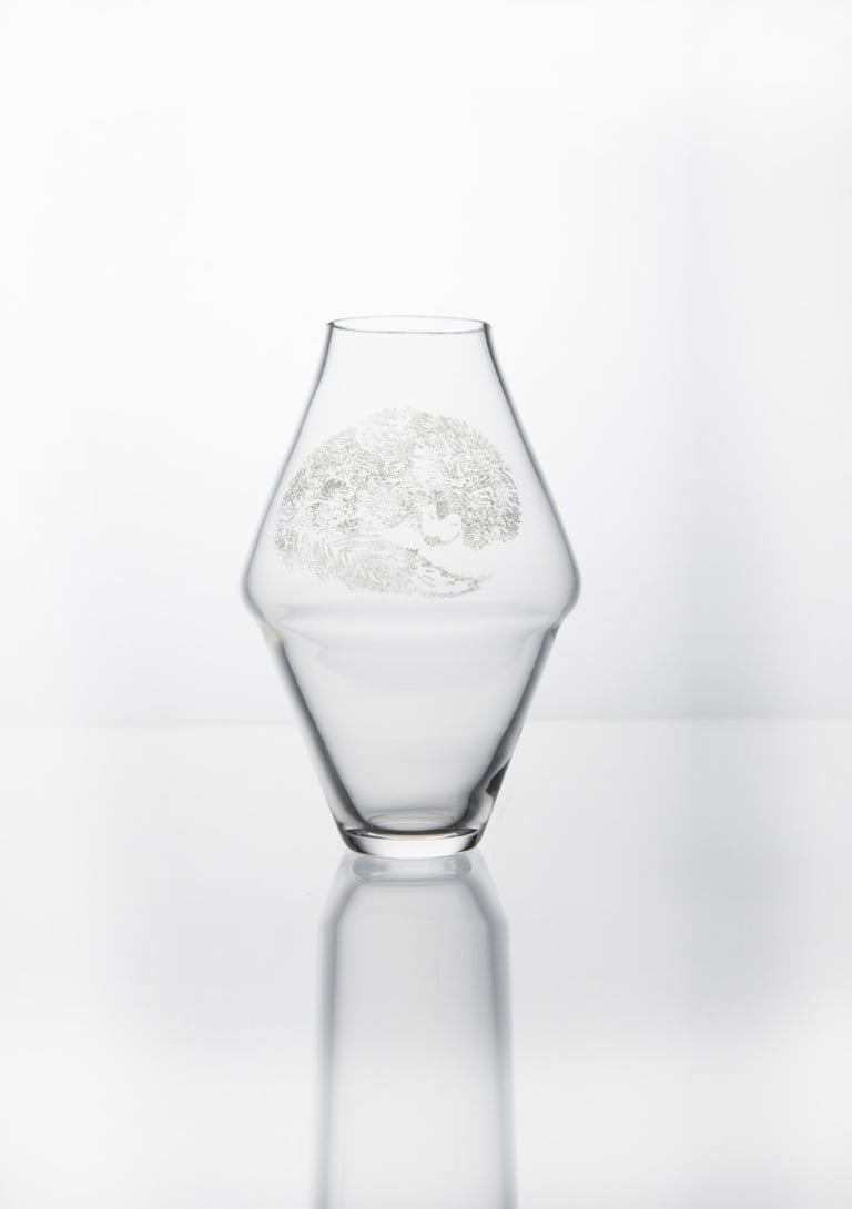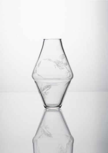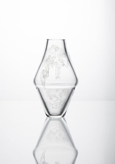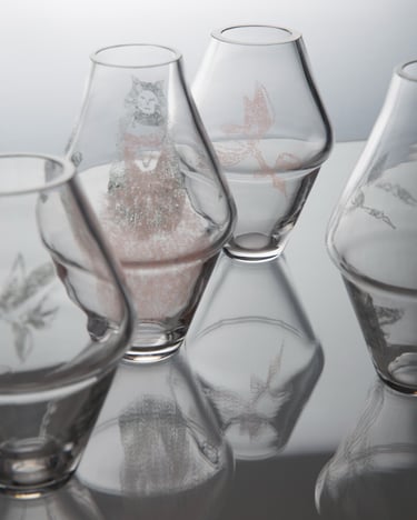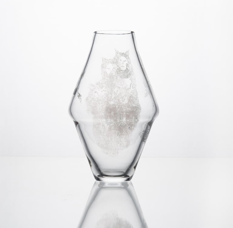 Vázy inspirované prolínáním světa přírody, zvířat a lidí. Symboly a postavy jsou vytvořené technikou litografie.