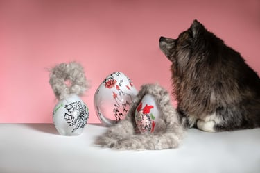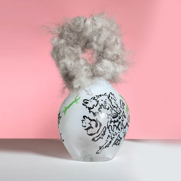 foukané sklo, tavená plastika, malba sklem, srst japonské Akita-inu, brus
