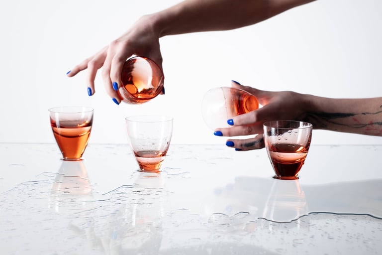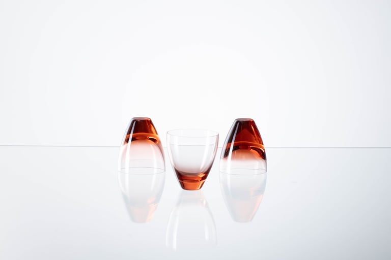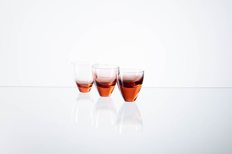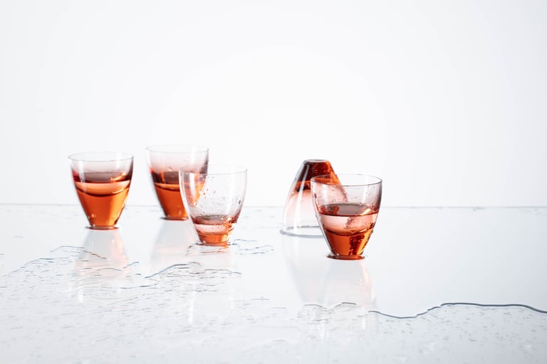 Skleničky jsou foukané ve sklárně Květná 1794 v barvě rozalínu. Jsou vytvořené ve třech variantách tloušťky ledu (spodní části sklenice) a zároveň tak vytváří díky tomuto detailu hru s odstupňováním.